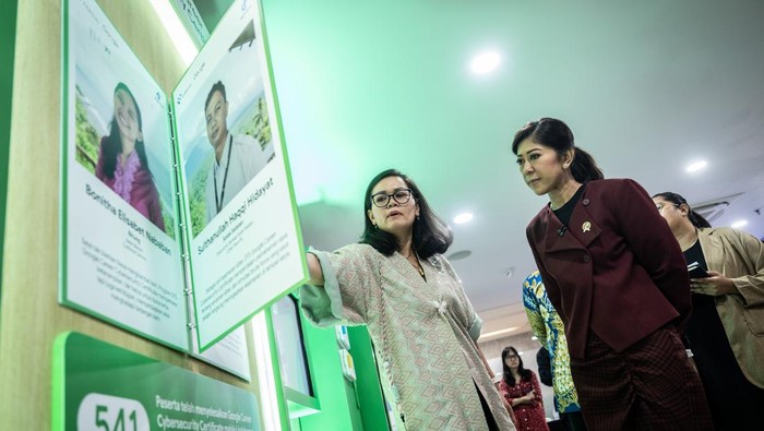 Menteri Komunikasi dan Digital (Menkomdigi) Meutya Hafid (kanan) bersama Direktur Hubungan Pemerintah dan Kebijakan Publik Google Indonesia Putri Alam (kiri) meninjau zona pengalaman Google saat peluncuran Google Play Protect di Kantor Kementerian Komdigi, Jakarta, Selasa (18/2/2025).