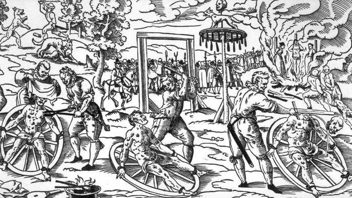 Roda penyiksa: Berbagai metode penyiksaan berbasis roda cukup marak di Abad Pertengahan. Salah satunya mengikat pria di roda, mematahkan anggota tubuhnya, lalu menggelindingkannya ke lereng yang permukaannya tidak rata berisi bebatuan dan semak berduri. Saat roda mencapai dasar bukit, korban penyiksaan sudah meninggal atau akan meninggal karena luka parah. Kadang, proses ini diulangi untuk orang yang sama hingga mereka meninggal. Selain itu, para penyiksa sering menggunakan roda berpaku logam atau struktur seperti pisau di pinggirannya.Β Foto: Unwired