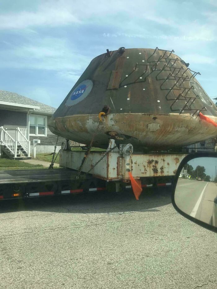 Apa itu? UFO? Ini merupakan Orion 'boilerplate' yang digunakan untuk pelatihan dan pengujian. Yang ini tampaknya merupakan tiruan untuk menguji gaya percikan dan kemudian untuk melatih prosedur pemulihan kapsul. Foto: gcso via Bored Panda Β