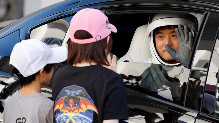 Spesialis Misi SpaceX Crew-10 NASA Takuya Onishi dari JAXA Jepang melambaikan tangan kepada keluarganya saat ia berangkat bersama anggota kru lainnya dari Gedung Operasi & Pemeriksaan di Kennedy Space Center menuju Kompleks Peluncuran 39-A menjelang peluncuran mereka ke Stasiun Luar Angkasa Internasional di Cape Canaveral, Florida, AS, Rabu (12/3/2025). Β