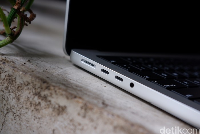 Bagian kiri terdapat port MagSafe 3, 2xThunderbolt 5 (USB-C) dan jack audio 3,5mm. Thunderbolt 5 yang memiliki kecepatan transfer lebih dari dua kali lipat hingga 120 Gb/dtk, memungkinkan penyimpanan eksternal yang lebih cepat, sasis perluasan, serta solusi hub dan docking yang andal Foto: Adi Fida Rahman/detikINET