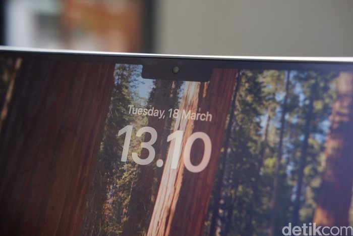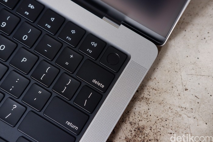Bagian atas terdapat notch tempat webcam 12 MP yang dibekali fitur Center Stage. Fitur ini secara otomatis membuat pengguna tetap menjadi fokus dalam frame meskipun banyak bergerak. Kamera baru pada MacBook Pro M4 juga mendukung Tampilan Meja, yang menambahkan dimensi baru dalam panggilan video Foto: Adi Fida Rahman/detikINET
