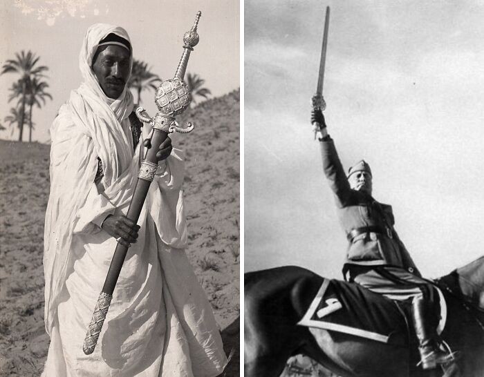 Pedang seremonial, yang dipesan oleh Mussolini pada tahun 1937 dan dibuat oleh Picchiani e Barlacchi, diberikan kepadanya oleh kolaborator Berber di Libya Italia. Pedang itu hilang setelah Juli 1943, ketika kediaman Mussolini, Rocca delle Caminate, dihancurkan dan dijarah oleh Perlawanan Italia. Foto: Boredpanda