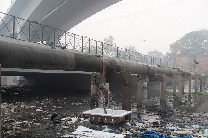 Seorang pria terlihat mandi saat air bocor dari pipa di New Delhi, India. Foto: Boredpanda