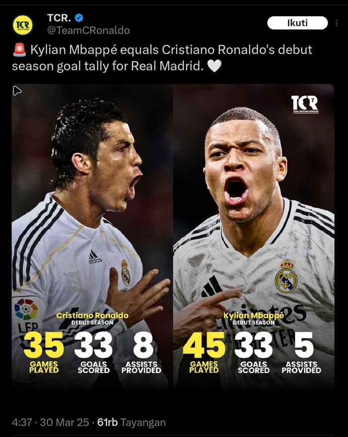 Liga Spanyol belum berakhir tapi Kylian Mbappe sudah bikin setara dengan legenda Real Madrid Cristiano Ronaldo. Foto: Twitter/X