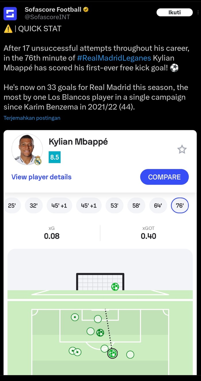 Uniknya, salah satu gol yang diselatkan Mbappe ke gawang Leganes tadi malam itu merupakan tendangan bebas pertama yang berhasil merobek jala lawan. Foto: Twitter/X