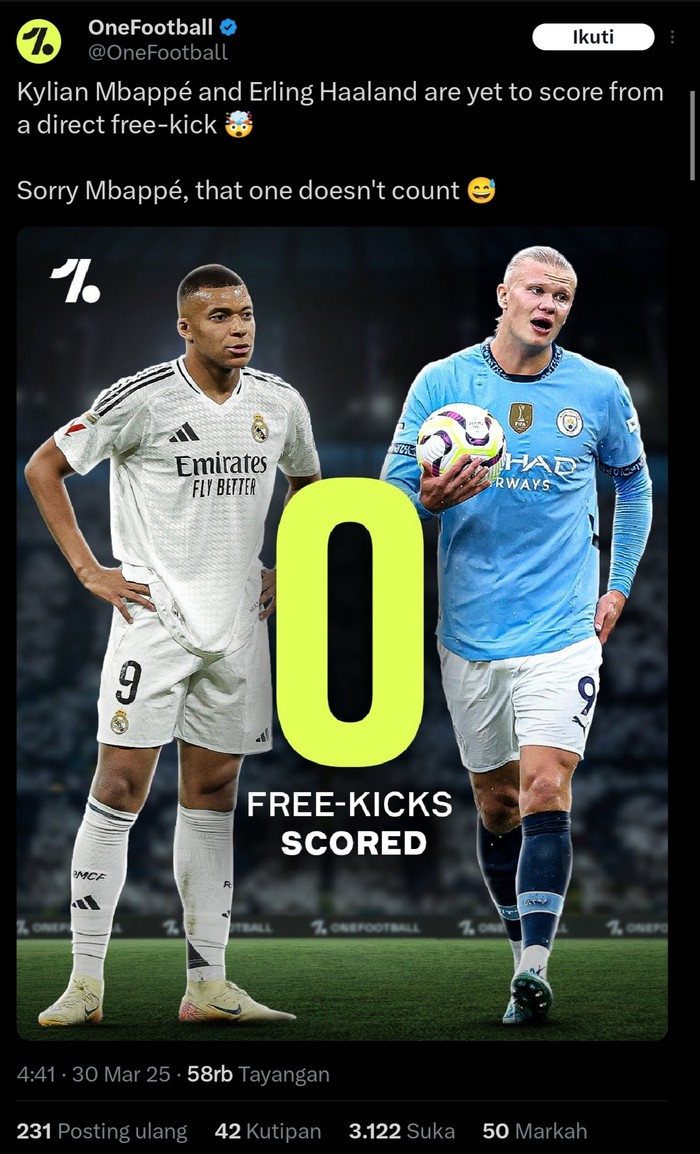 Namun karena gaya tembakannya yang diumpan dulu ke rekannya sebelum Mbappe tendang dinilai itu bukan free kick. Foto: Twitter/X