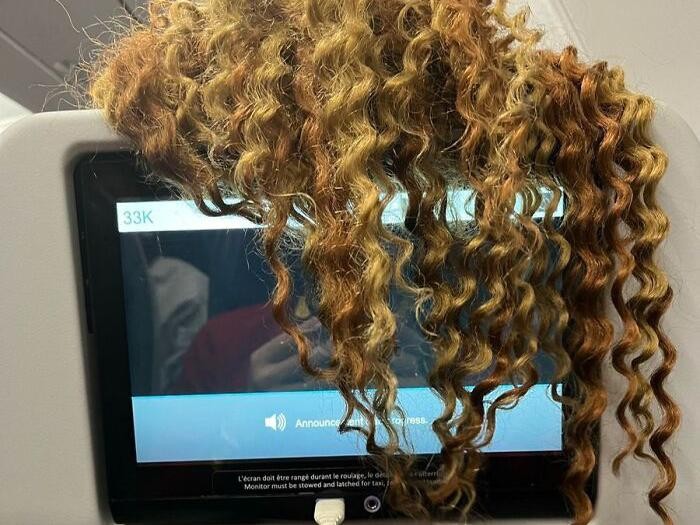 Layar untuk hiburan tertutup rambut penumpang di depannya. Foto: MarthaFarcuss via Bored Panda