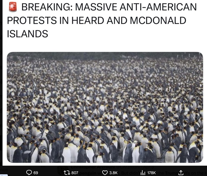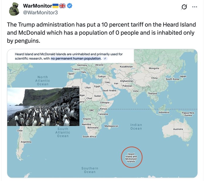 Wilayah Kepulauan Heard dan McDonald (HIMI) di Antartika bukanlah negara, tapi kena aturan tarif 10 persen oleh Trump. Padahal, ini adalah habitat penguin, tidak ada manusianya. Lokasinya pun jauh, 4.000 km di barat daya Perth, Australia. Foto: X.com