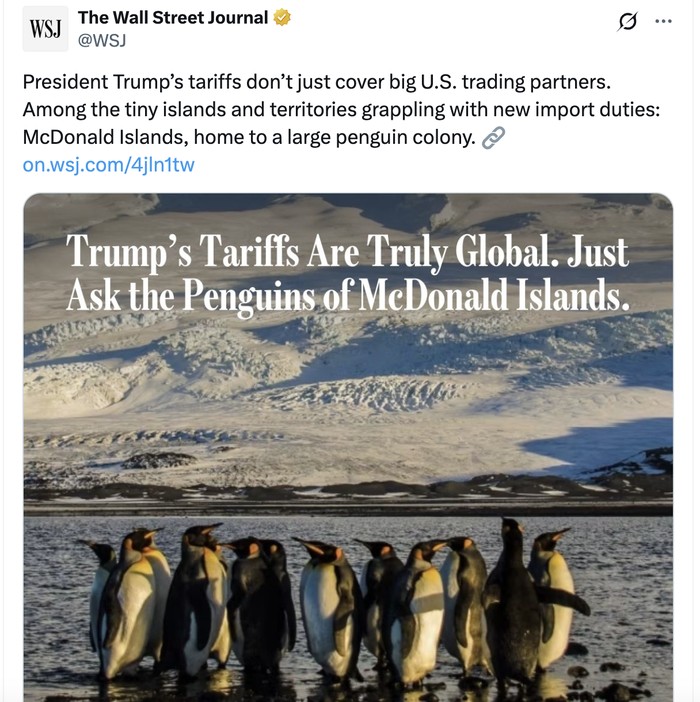 Media pun ramai memberitakannya. "Tarif Trump benar-benar global, tanyakan pada pengun di Pulau McDonald," tulis Wall Street Journal. Foto: X.com