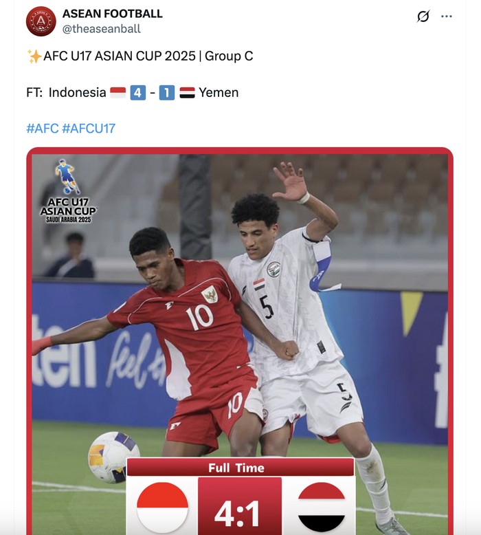 Timnas Indonesia untuk pertama kali lolos ke Piala Dunia U-17 via kualifikasi usai menang atas Yaman di Piala Asia U-17 2025. Timnas Indonesia U-17 mengalahkan Yaman 4-1 dalam lanjutan Grup C Piala Asia U17 2025 di Stadion Prince Abdullah Al Faisal Sports City, Senin (7/4/2025) malam. Kemenangan ini membuat Indonesia mengoleksi enam angka. Pada laga sebelumnya, anak asuhan Nova Arianto ini menang 1-0 melawan Korea Selatan. Foto: X.com