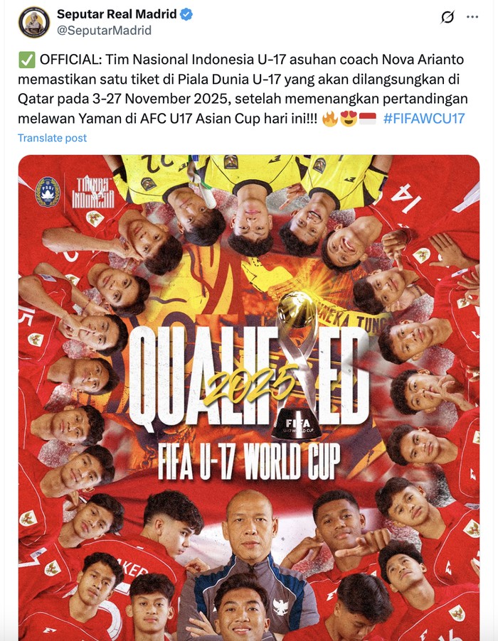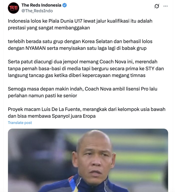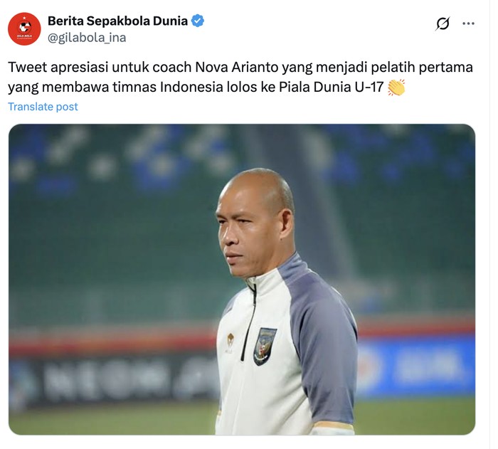 Apresiasi untuk Nova Arianto yang berhasil meloloskan Timnas Indonesia ke Piala Dunia U-17 dari jalur kualifikasi. Foto: X.com