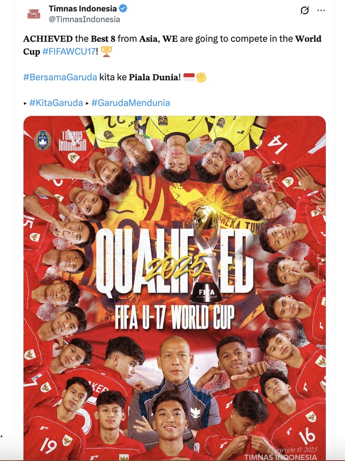Timnas Indonesia U-17 menjadi satu-satunya tim dari Asia Tenggara yang lolos Piala Dunia U-17 2025. Foto: X.com