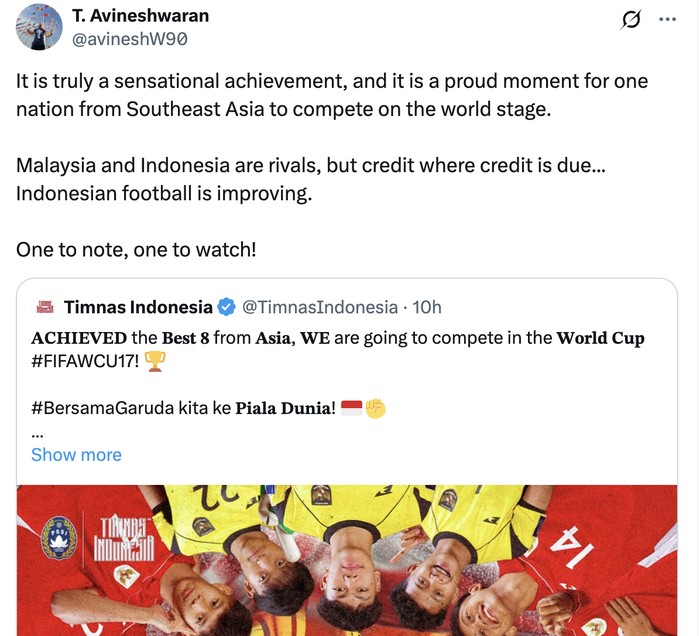 Akun dari negara tetangga pun ikut memuji pencapaian Timnas Indonesia U-17. Foto: X.com