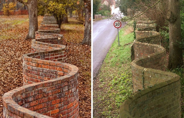 Di Inggris, Anda terkadang melihat pagar bata "bergelombang" ini. Meski tampak aneh, bentuk ini menggunakan lebih sedikit bata daripada dinding lurus. Dinding lurus membutuhkan setidaknya dua lapis bata agar kokoh, tetapi dinding bergelombang tidak masalah berkat dukungan lengkung yang disediakan oleh gelombang. Foto: Boredpanda