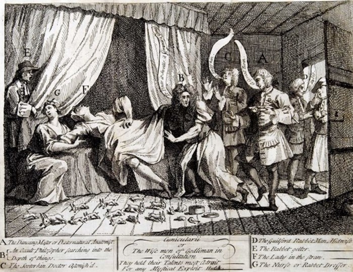 Pada tahun 1726, seorang wanita bernama Mary Toft menjadi pusat perhatian ketika ia mengaku telah melahirkan puluhan kelinci dan hewan lainnya yang mati. Ia menjadi selebritas kecil. Kebohongan itu terbongkar ketika seseorang memergoki seorang pembantu yang mencoba menyelundupkan seekor kelinci ke kamar Mary. Ia melakukan sesuatu yang tidak ingin kami sebutkan untuk melahirkan kelinci-kelinci itu. Foto: Ebaumsworld