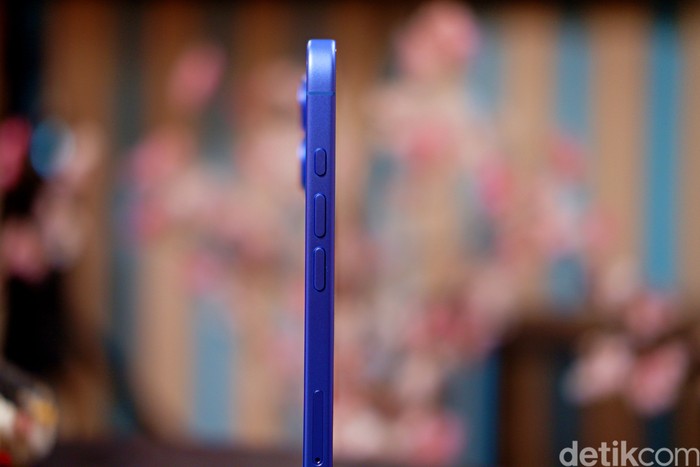 Tampilan iPhone 16 Plus Ultramarine tidak hanya soal estetika, tetapi juga fungsionalitas. Apple memperkenalkan Camera Control, tombol khusus di sisi perangkat yang memungkinkan pengguna mengakses fungsi kamera dengan cepat, seperti zoom atau pengaturan kedalaman bidang, hanya dengan geseran jari. Tombol ini dilengkapi Taptic Engine untuk umpan balik haptic yang presisi. Foto: Adi Fida Rahman/detikINET