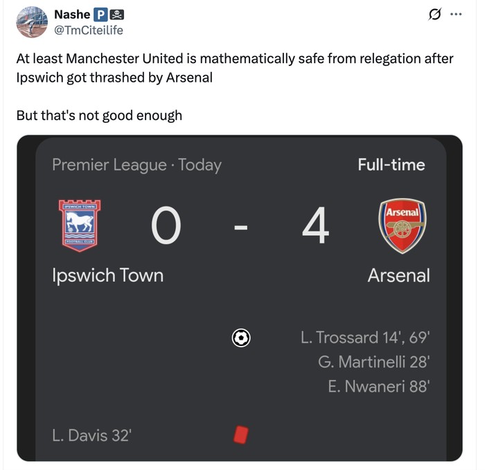 FotoINET Meme Manchester United Selamat dari Degradasi Pool - detikInet Senin, 21 Apr 2025 10:15 WIB Tautan telah disalin Jakarta - Meski kalah 0-1 di kandang sendiri dari Wolverhampton Wanderers, Manchester United dipastikan selamat dari degradasi. Wolves berhasil menaklukkan Manchester United 1-0 di kandang lawan. Foto: X.com Namun MU secara matematis sudah selamat dari degradasi setelah Ipswich Town dibantai Arsenal. Foto: X.com Ya, MU di musim ini memang sangat buruk sehingga terancam degradasi, untung selamat. Foto: X.com Bahkan Wolves berhasil mengalahkan MU dua kali. Foto: X.com Selamat Ruben Amorim, memyelamatkan MU dari degradasi. Foto: X.com Meme fans MU merayakan klubnya lolos dari degradasi. Foto: X.com MU di Liga Inggris sangat payah tapi memukau di Europa League. Foto: X.com Banyak pemain MU tampil buruk, seperti Hojlund yang sangat miskin gol. Foto: X.com Untuk pertama kalinya, MU kalah 15 kali di Liga Inggris. Foto: X.com Amorim lebih suka Europa League dari Liga Inggris. Foto: X.com (/) TAGS manchester united netizen LIHAT LAINNYA Tautan telah disalin