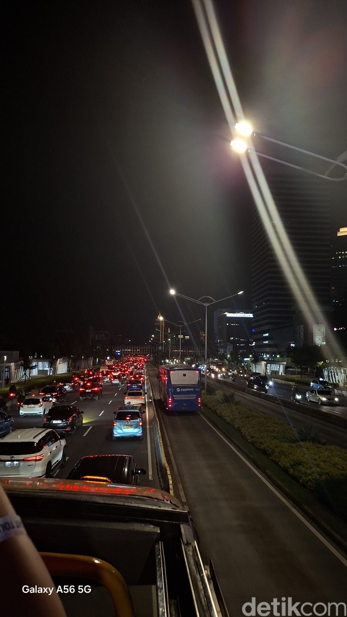 Jakarta - Galaxy A56 dilengkapi tiga kamera belakang yang jago mengambil foto dalam segala suasana. Seperti saat keliling Jakarta malam hari menggunakan open top bus.