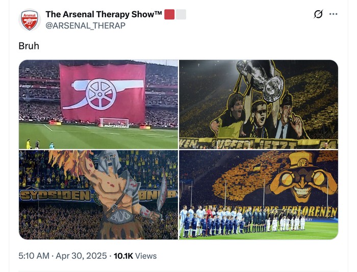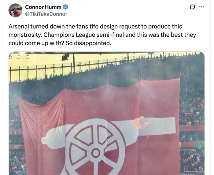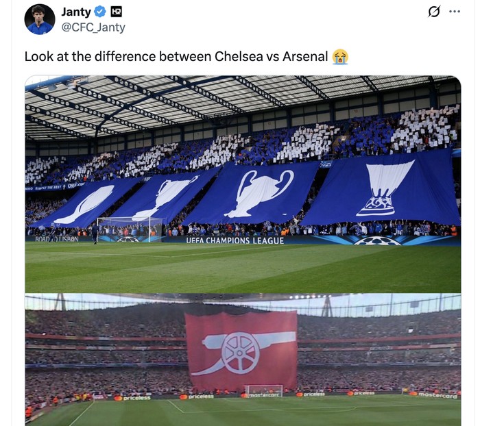 Di media sosial, netizen banyak menyoroti koreografi suporter Arsenal yang tampak biasa saja dibanding tim lain. Foto: X.com