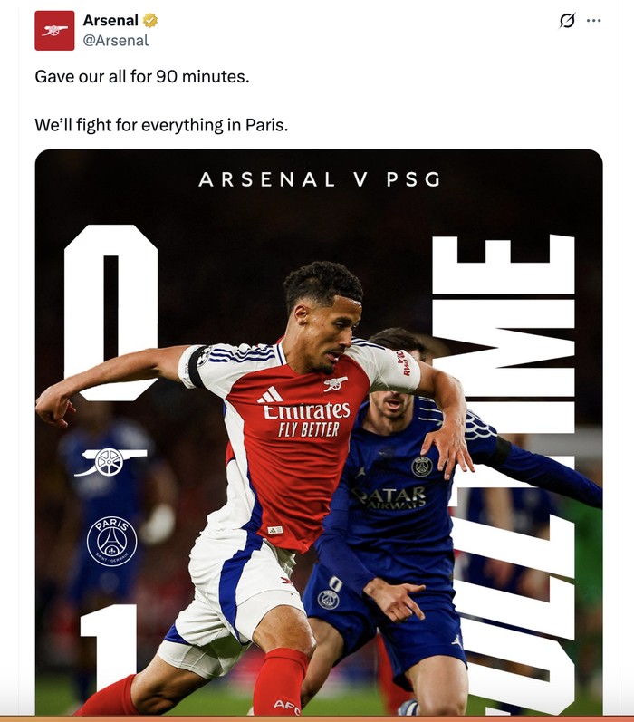 Akun resmi Arsenal berjanji mereka akan mengerahkan segalanya di leg 2 nanti. Foto: X.com