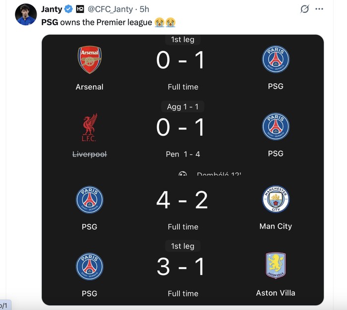PSG benar-benar menjadi momok tim Liga Inggris di Liga Champions. Foto: X.com