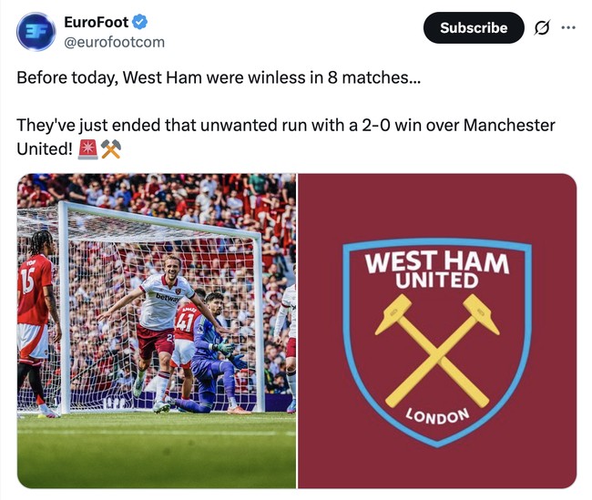 West Ham gagal menang di 8 pertandingan dan baru berhasil meraih 3 poin lawan Manchester United. Foto: X.com