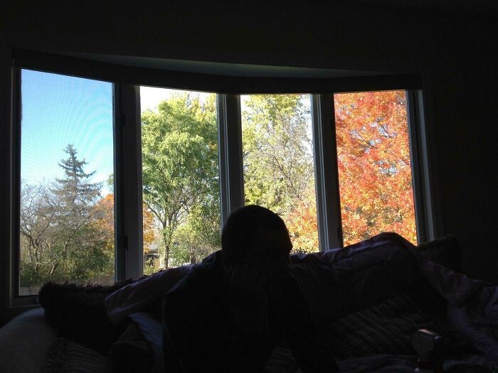 Jendela di belakang rumahnya kelihatan seperti menampilkan empat musim yang berbeda-beda. Foto: pommiegurl130 via Bored Panda Β