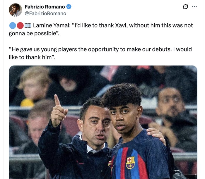 Fabrizio Romano mengunggah pernyataan Yamal tentang Xavi yang dulu memberinya kesempatan. "Saya berterima kasih pada Xavi, tanpa dia hal ini tidak mungkin. Dia memberi pemain muda peluang untuk membuat debut," cetus Yamal. Foto: X.com