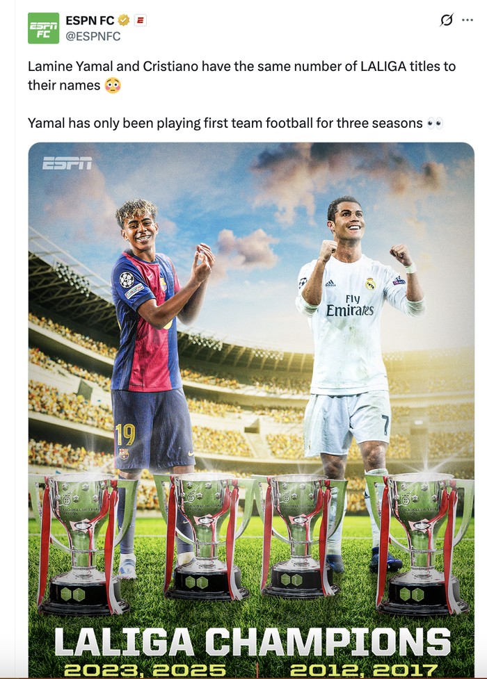 Di usia sangat muda, Yamal sudah dua kali juara La Liga bersama Barcelona, menyamai pencapaian Cristiano Ronaldo saat membela Real Madrid. Foto: X.com