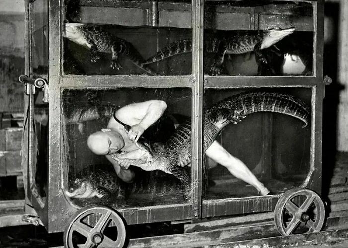 Seorang Pemain Sirkus di Dalam Mobil Akuarium Bersama Buaya, Berlin, 1933 Foto: Boredpanda