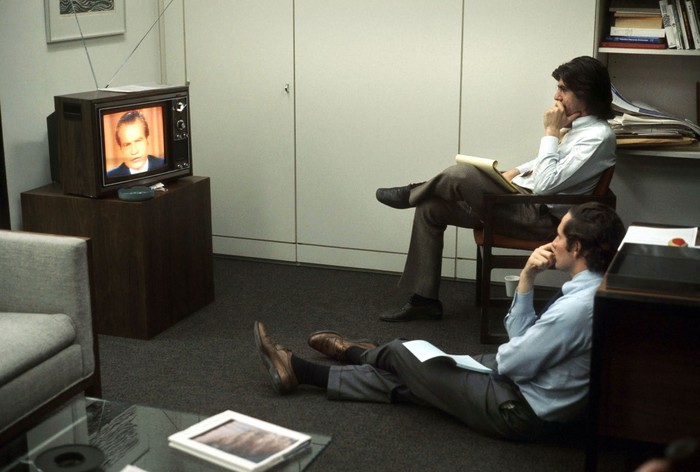 Setelah Gedung Putih mengklaim selama lebih dari setahun bahwa Bob Woodward dan Carl Bernstein mengarang cerita dan menciptakan sumber fiktif, kini mereka menyaksikan Presiden Richard Nixon mengundurkan diri di televisi Foto: Boredpanda