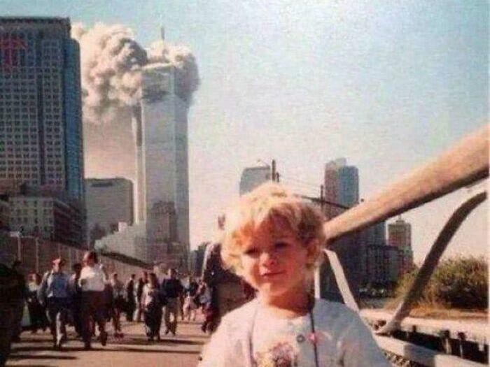 Seorang anak laki-laki difoto beberapa saat setelah pesawat pertama menabrak World Trade Center dalam Tragedi 9/11. Perhatikan, orang-orang di belakang si bocah ini juga belum sadar adaΒ kejadian mengerikan. Foto: Boredpanda