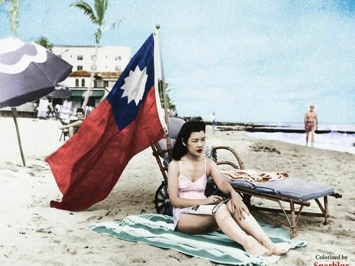 Ruth Lee, seorangΒ pemilikΒ restoran China di Miami, AS harus mengibarkan benderaΒ TaiwanΒ agar dia tidak dikira orang Jepang saat dia berjemur di hari liburnya di Pantai Miam, 15 Desember 1941. Saat itu Amerika sudah mulai berperang dengan Jepang dalam Perang Dunia II. Foto: Boredpanda