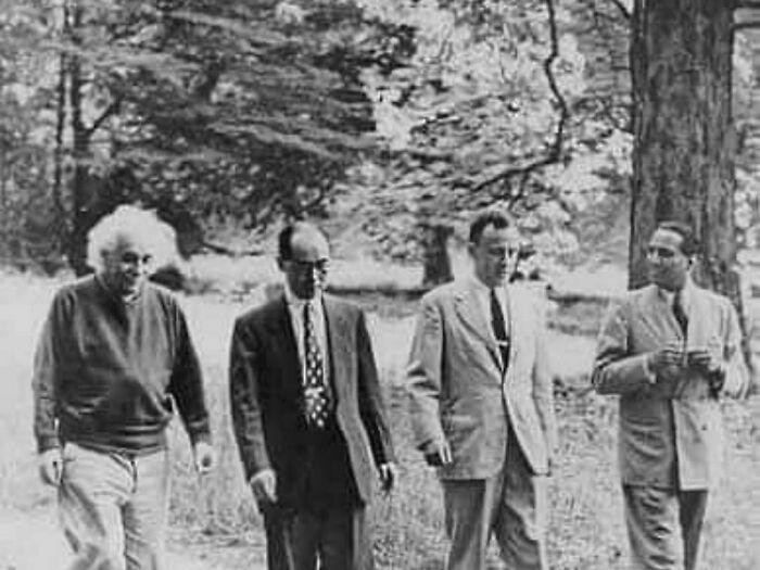 Momen bersejarah empat fisikawan berjalan-jalan bersama: Albert Einstein, Hideki Yukawa, John Wheeler, dan Homi Bhabha tahun 1954. Foto: Boredpanda
