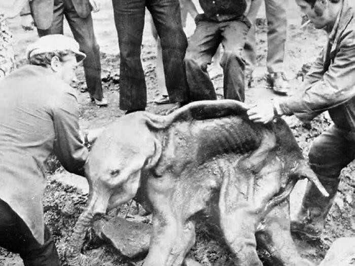 FosilΒ anak mammoth yang diawetkan tidak sengajaΒ karena bekuΒ di Siberia, 40 ribu tahun lalu. Penggalian ini pada tahun 1977 oleh buldoser penambang. Bayi mammoth ini diperkirakan mati di usia 6-8 bulan dan dinamai DimaΒ dari nama sungai lokal. Perutnya masih berisi jejak air susuΒ induknya. Foto: Boredpanda