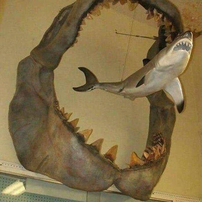 Rahang hiu megalodon purba yang hidup sekitar 23 hingga 3,6 juta tahun laluΒ dibandingkan dengan ukuranΒ hiu putih besar zaman modern. Ngeri banget ukurannya! Foto: Boredpanda