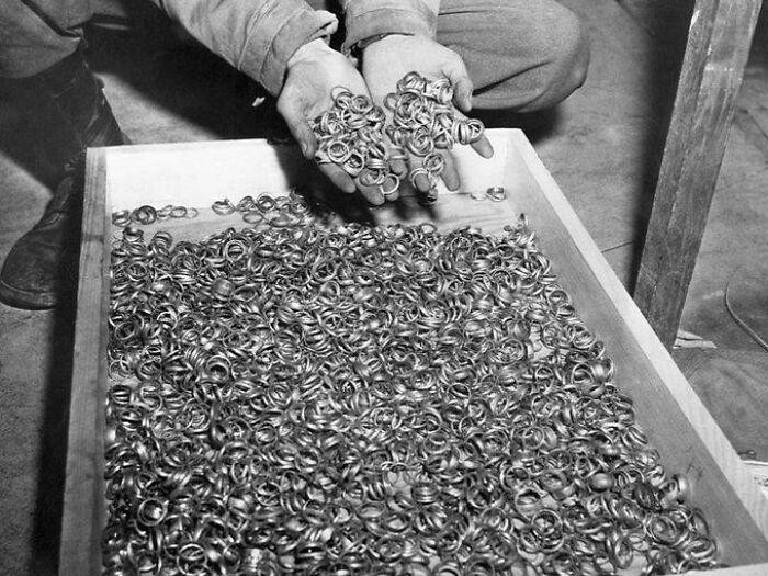 Kumpulan cincin kawin yang dicopot dari korban Holocaust sebelum mereka dieksekusi tahun 1945. Foto: Boredpanda