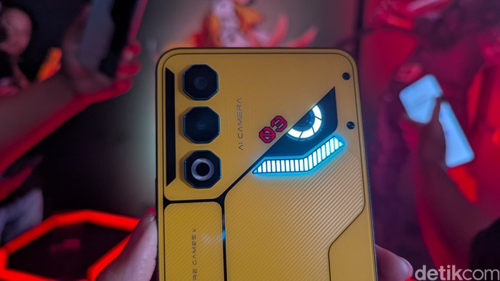Ponsel ini hadir dengan kamera berbentuk segi delapan dan aksen RGB lighting yang memberikan nuansa gaming yang kental. Kamera utamanya 50 MP. Foto: Virgina Maulita Putri/detikINET