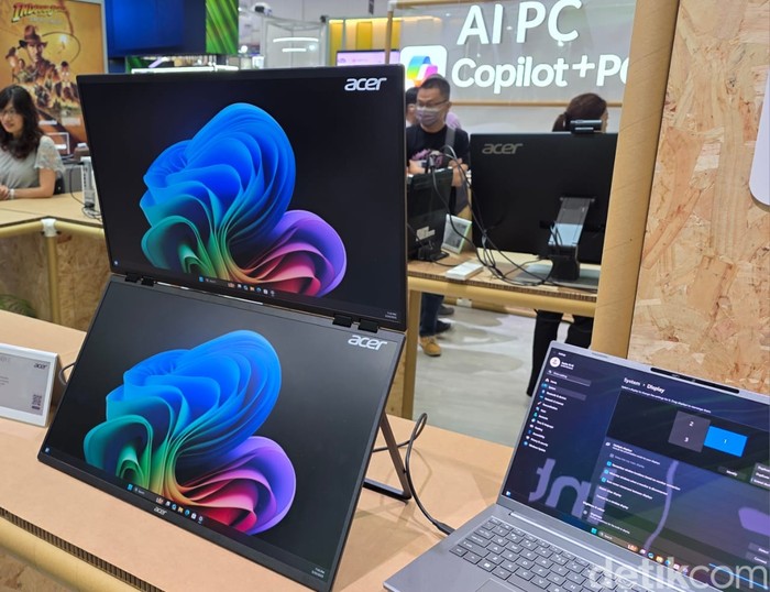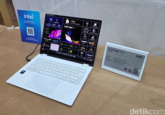 Beragam produk andalan terbaru Acer ditampilkan, termasuk Acer Swift Edge 14 AI ini. Laptop super ringan ini dibekali AI dan spesifikasi mumpuni.Β Foto: Fino Yurio Kristo/detikINET