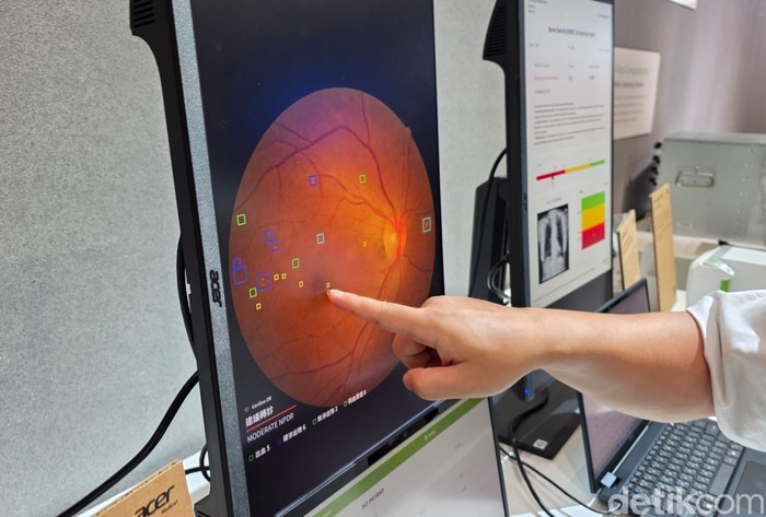 Perangkat lunak ini memanfaatkan teknik pembelajaran mendalam AI untuk menghasilkan hasil diagnosis yang mirip dengan dokter mata profesional. Perangkat lunak ini diklaim memiliki akurasi penyaringan sebesar 93%.Β Foto: Fino Yurio Kristo/detikINET