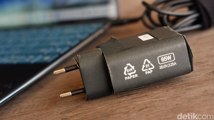 Performanya disokong baterai 75WHr yang diklaim dapat bertahan hingga 17 jam dalam sekali pengisian. Dalam paket penjualan diberikan adaptor charger 65W Foto: Adi Fida Rahman/detikINET