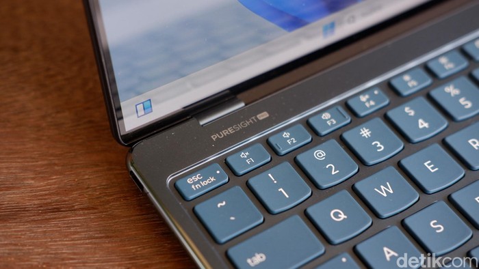 Kamera Yoga Slim 9i akan disembunyikan di bawah panel display dan baru terlihat saat digunakan bisa menghadirkan layar yang benar-benar penuh. Kamera Yoga Slim 9i memiliki resolusi 32 MP dengan teknologi Visionary.ai. Foto: Adi Fida Rahman/detikINET
