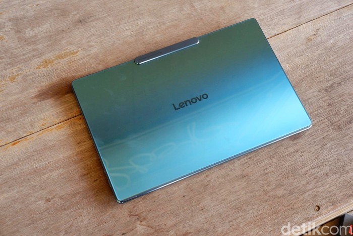 Material ini memberikan efek visual berkilau yang eksklusif, menjadikan Yoga Slim 9i tampil beda dari laptop pada umumnya. Lapisan kaca ini tidak hanya estetis, tetapi juga dirancang untuk tahan terhadap tekanan, benturan, dan goresan, memastikan daya tahan sekaligus keindahan tetap terjaga. Foto: Adi Fida Rahman/detikINET