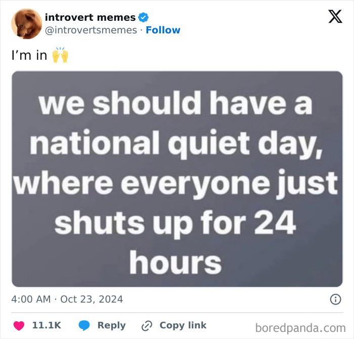 Kita butuh hari di mana orang diam selama 24 jam. Ada yang komen 'buat ini jadi wacana tiap minggu'. Foto: introvertsmemes via Bored Panda