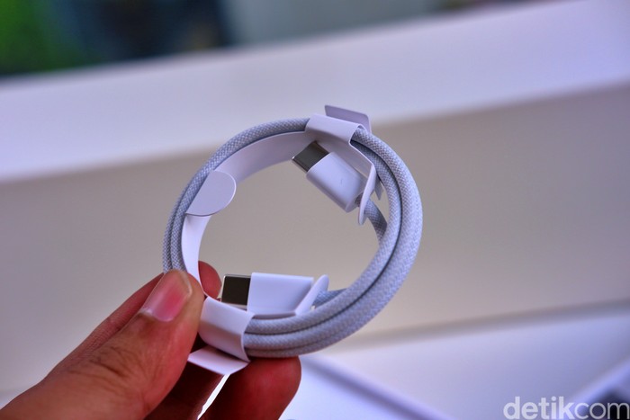 iPad Air M3 dilengkapi kabel USB-C berbahan nylon yang kuat dan tahan lama. Kabel ini dirancang simetris, dapat dibolak-balik, dan mendukung pengisian daya serta transfer data berkecepatan tinggi. Bahan nylon memberikan fleksibilitas dan ketahanan terhadap tekanan, terutama pada bagian kepala kabel yang sering menjadi titik lemah. Foto: Adi Fida Rahman/detikINET