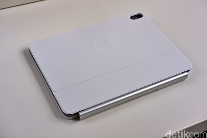Tersedia dalam warna putih, Magic Keyboard ini tidak hanya menawarkan pengalaman mengetik yang responsif dengan mekanisme gunting (1 mm travel), tetapi juga perlindungan depan dan belakang untuk iPad Air. Meski tanpa lampu latar dan umpan balik haptik seperti versi iPad Pro, keyboard ini tetap menjadi pendamping ideal dengan harga lebih terjangkau, Foto: Adi Fida Rahman/detikINET
