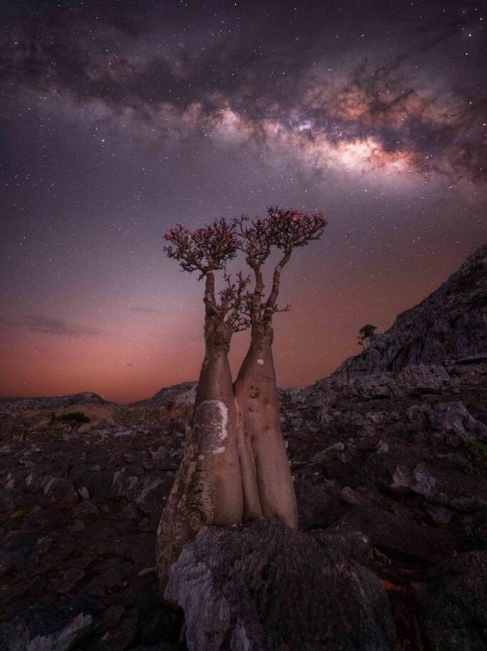 'Blooming Bottle Trees,' karya Rositsa Dimitrova. Foto ini diambil di Pulau Sokotra, Yaman yang memiliki langit malam paling gelap di dunia. Foto: Rositsa Dimitrova/Milky Way Photographer of the Year