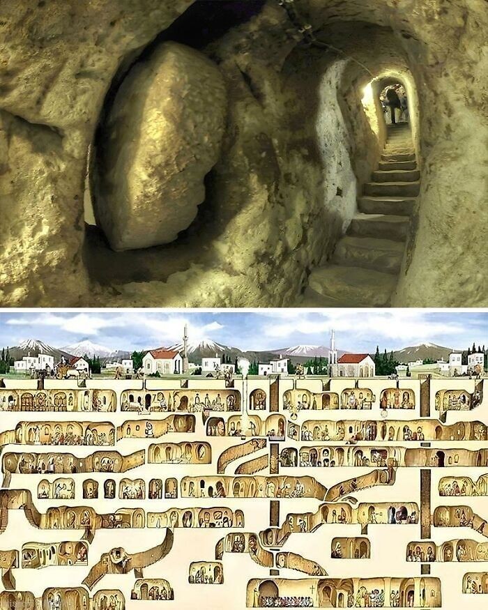 Dibangun pada abad ke-8 hingga ke-7 SM, kota ini berfungsi sebagai tempat berlindung selama invasi, khususnya pada era Bizantium. Motif kehidupan bawah tanah yang begitu luas masih menjadi misteriβapakah itu semata-mata untuk perlindungan, atau ada faktor lain yang berperan? Derinkuyu tidak hanya menonjolkan inovasi kuno tetapi juga mencerminkan ketahanan dan kemampuan beradaptasi para penciptanya. Foto: Boredpanda
