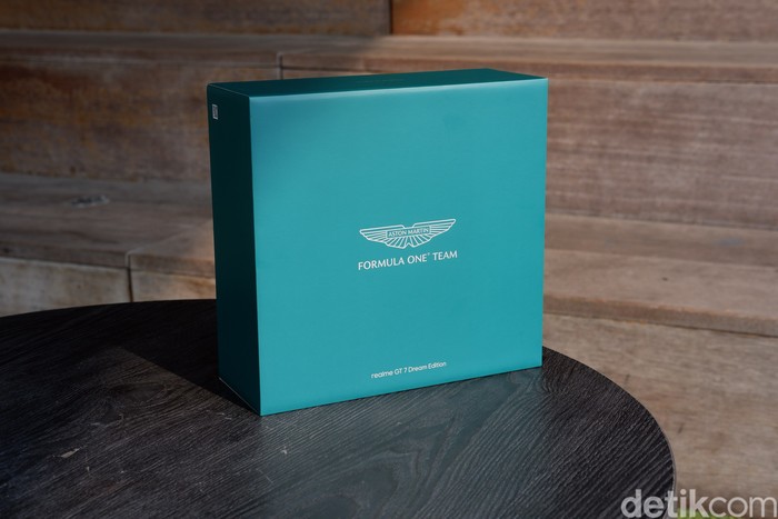 Realme GT 7 Dream Edition dikemas dalam paket penjualan eksklusif Limited Edition Co-branded Gift Box. Paket tersebut mencakup box dengan desain khusus berwarna Aston Martin Racing Green Foto: Adi Fida Rahman/detikINET